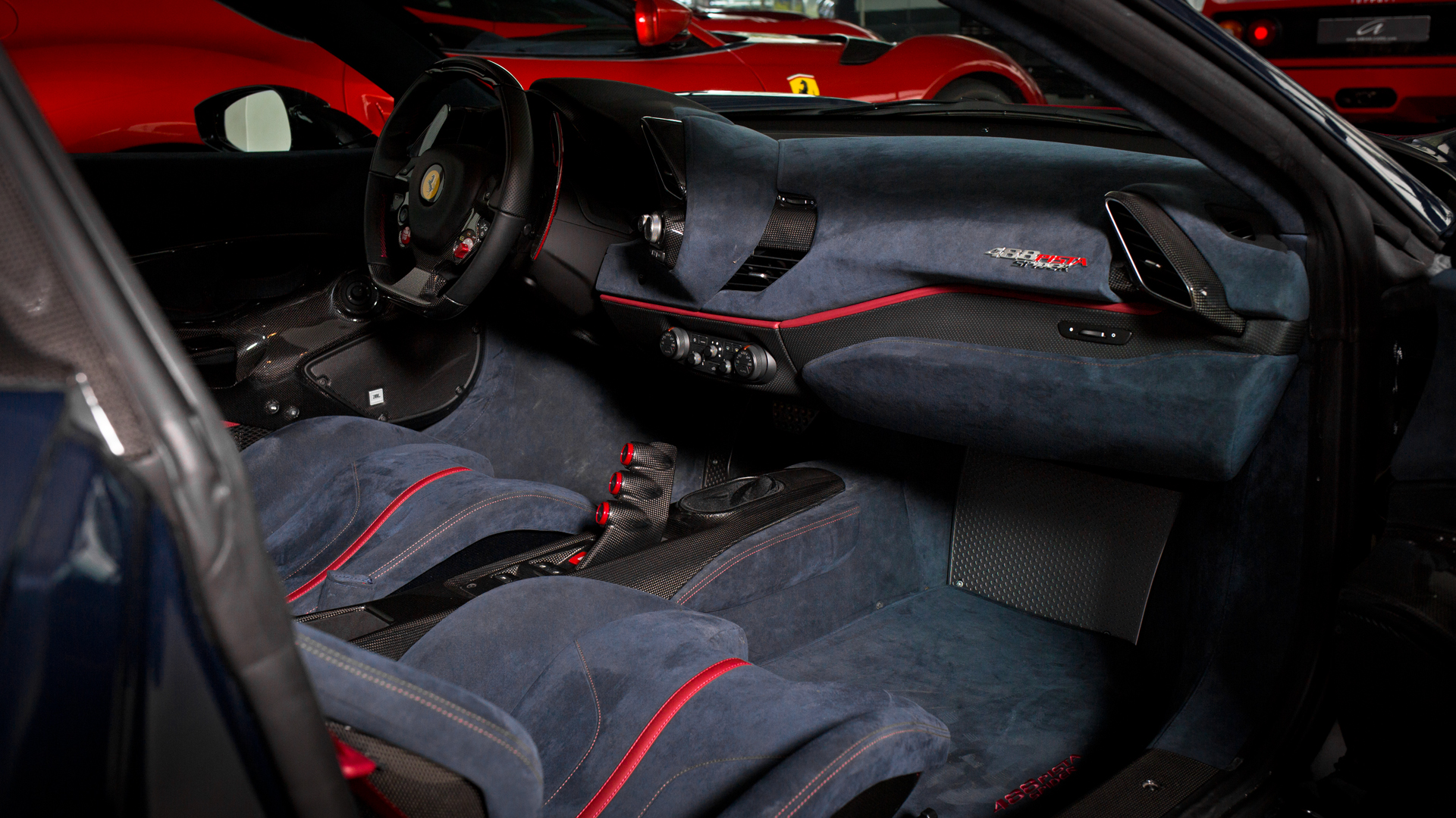 For sale at Amian Exclusive Cars in Cologne is a truly outstanding Ferrari 488 Pista Spider, presented in the stunning exterior color Blu Pozzi 520 and complemented by a luxurious Blu Medio 6633 Alcantara interior. This rare and elegant specification highlights the unique character of this high-performance open-top Ferrari.